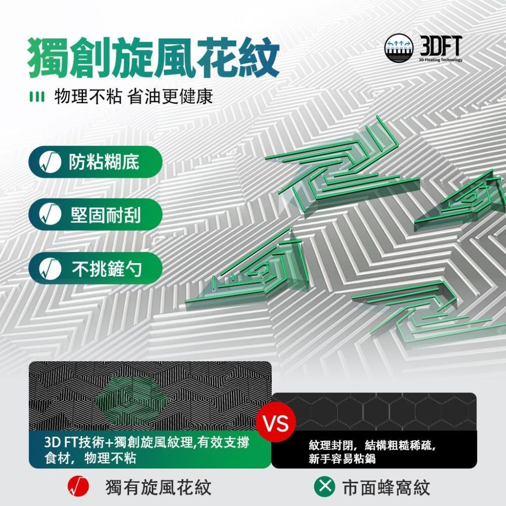特殊菱形紋理有效防⽌⾷材黏鍋,讓煎炒更順暢,避免⾷材糊底;